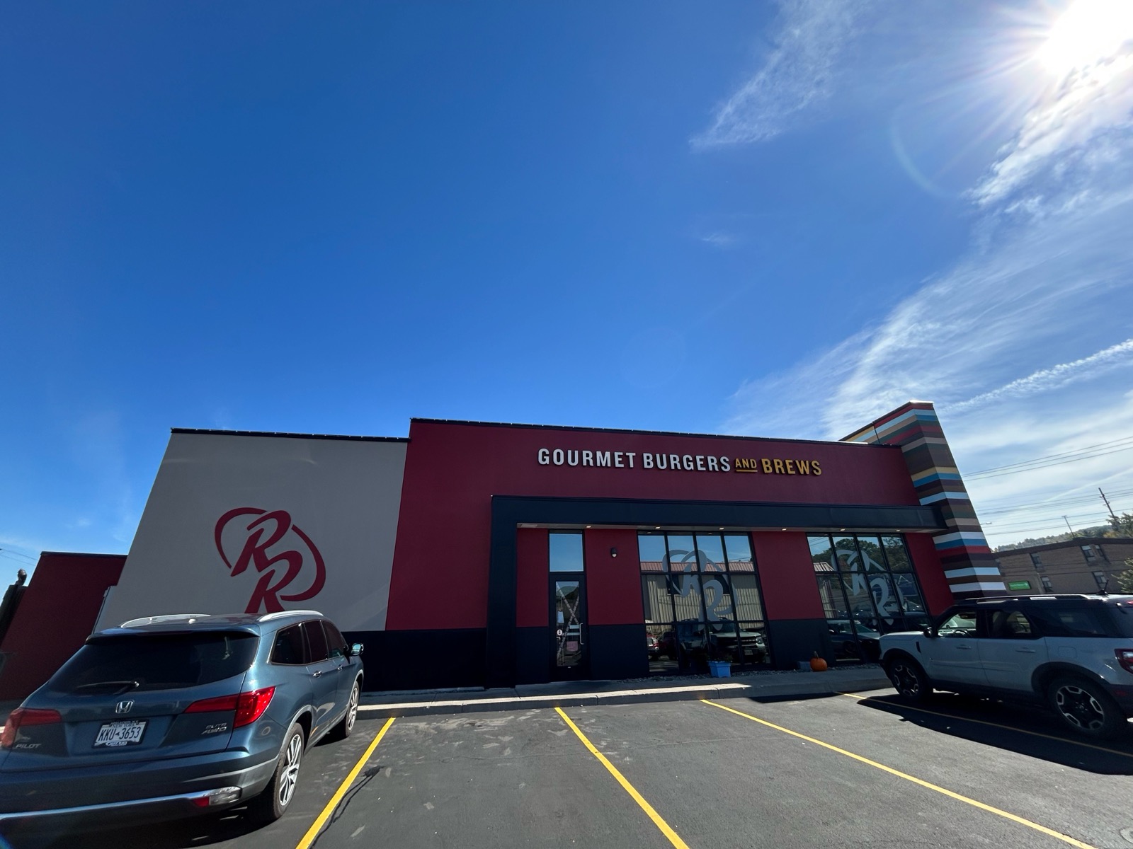 In daylight, the rich red tones come alive with depth, clarity, and consistency, while the smooth finish reflects light evenly for a polished appearance. In the evening, exterior lighting enhances the color’s warmth and vibrancy, helping the location stand out along the Vestal Parkway.