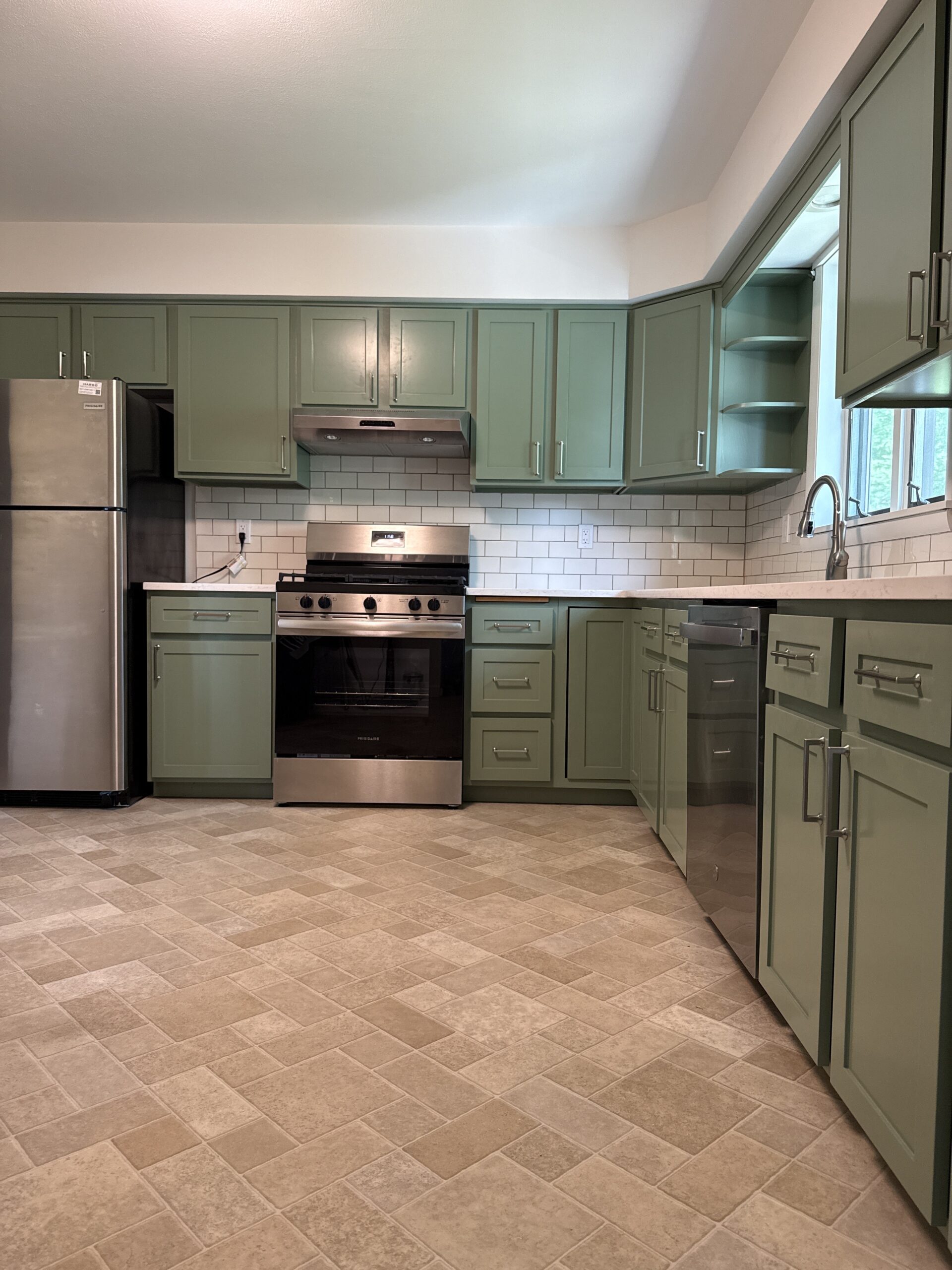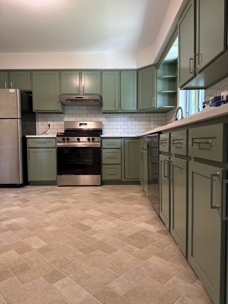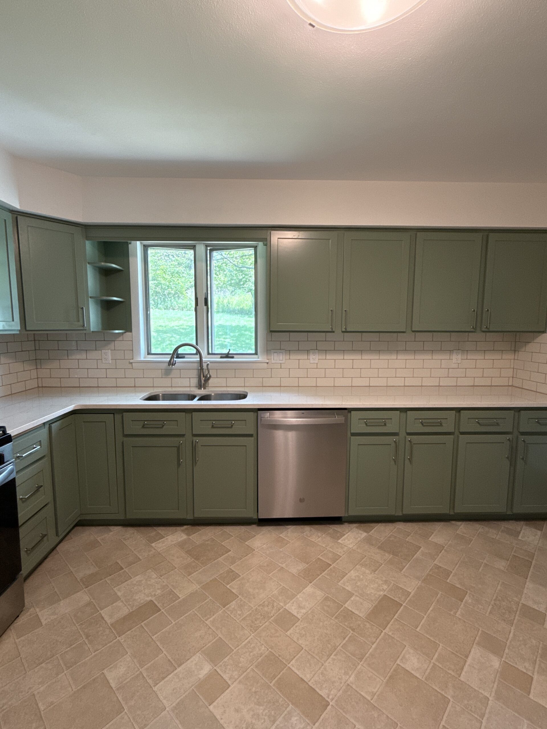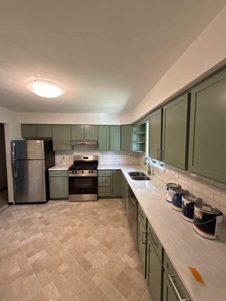 The finished cabinets became the centerpiece of the kitchen. The Adirondack Green finish provided depth, warmth, and sophistication, while the new hardware and custom-fitted drawers elevated functionality. What was once an ordinary kitchen now feels modern, cohesive, and designed with intention. Our work demonstrates why clients trust us—results that are as durable as they are beautiful.